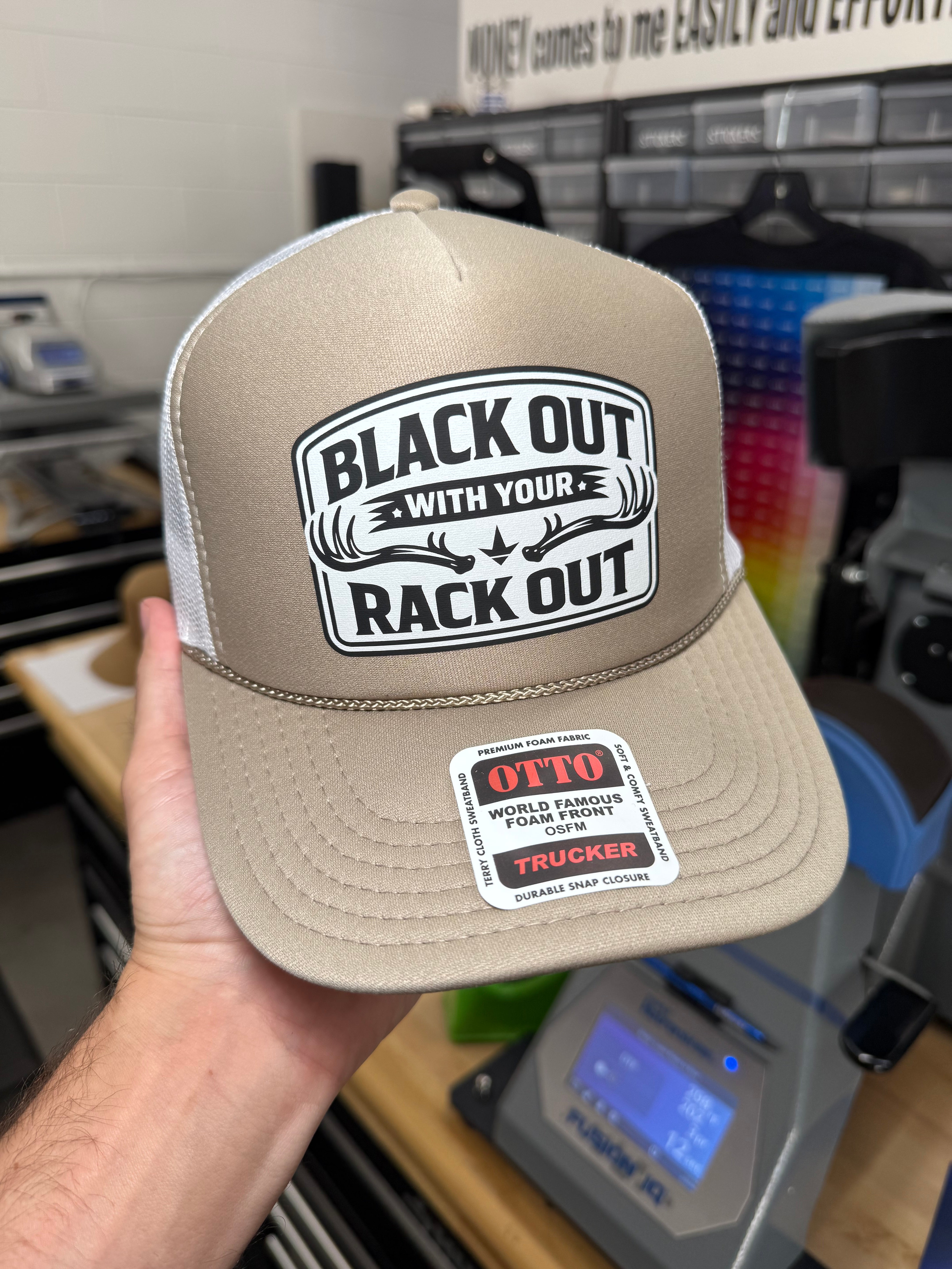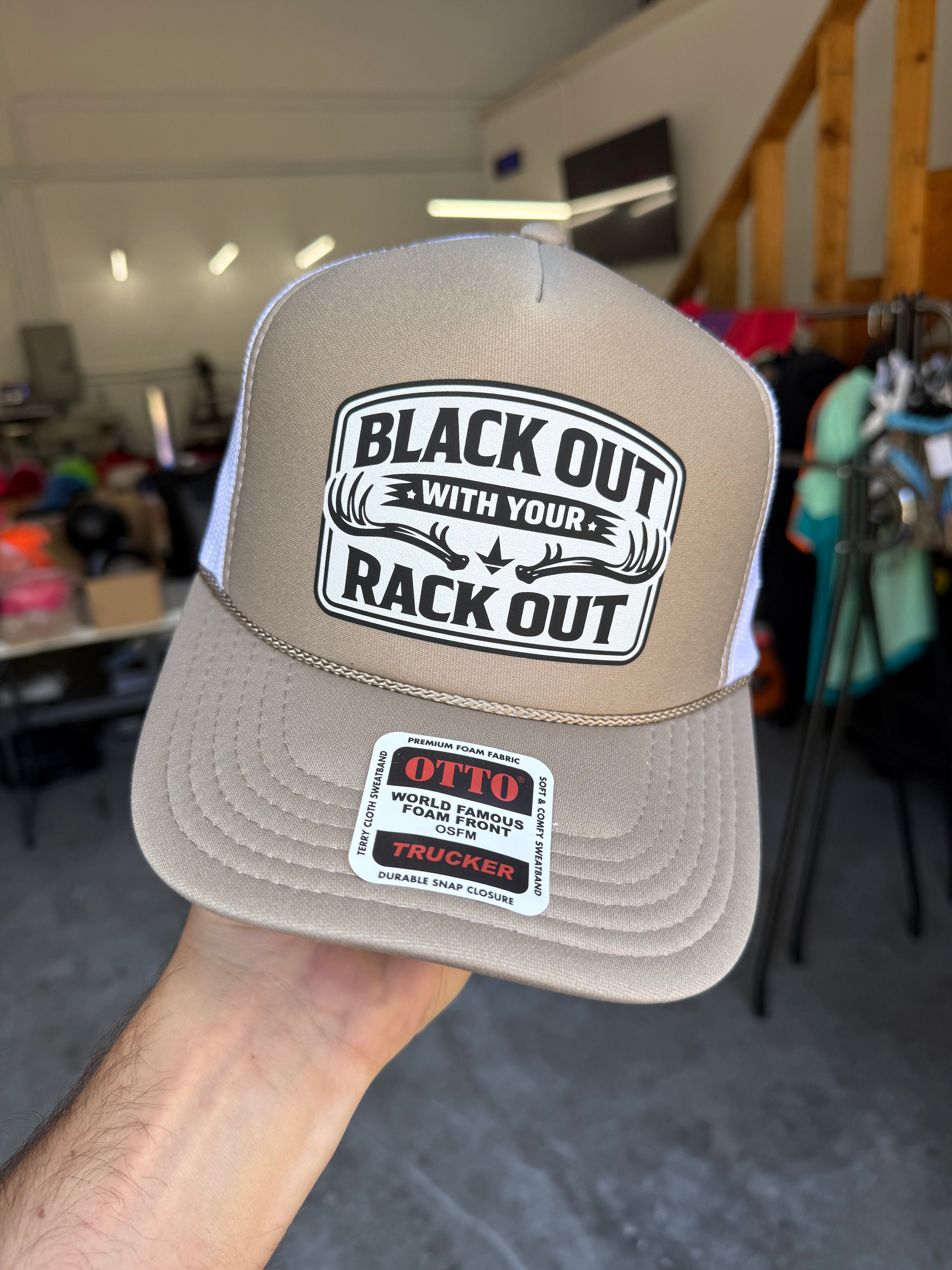 This bold khaki and white trucker hat features a tan foam front and matching tan bill with crisp white mesh side panels and back for that clean outdoorsy look. Front and center is a sharp black and white patch-style graphic with bold block lettering that reads “BLACK OUT WITH YOUR RACK OUT”. Framing the middle text are a pair of deer antlers, giving the whole design that perfect mix of hunting camp humor and barstool bad behavior.