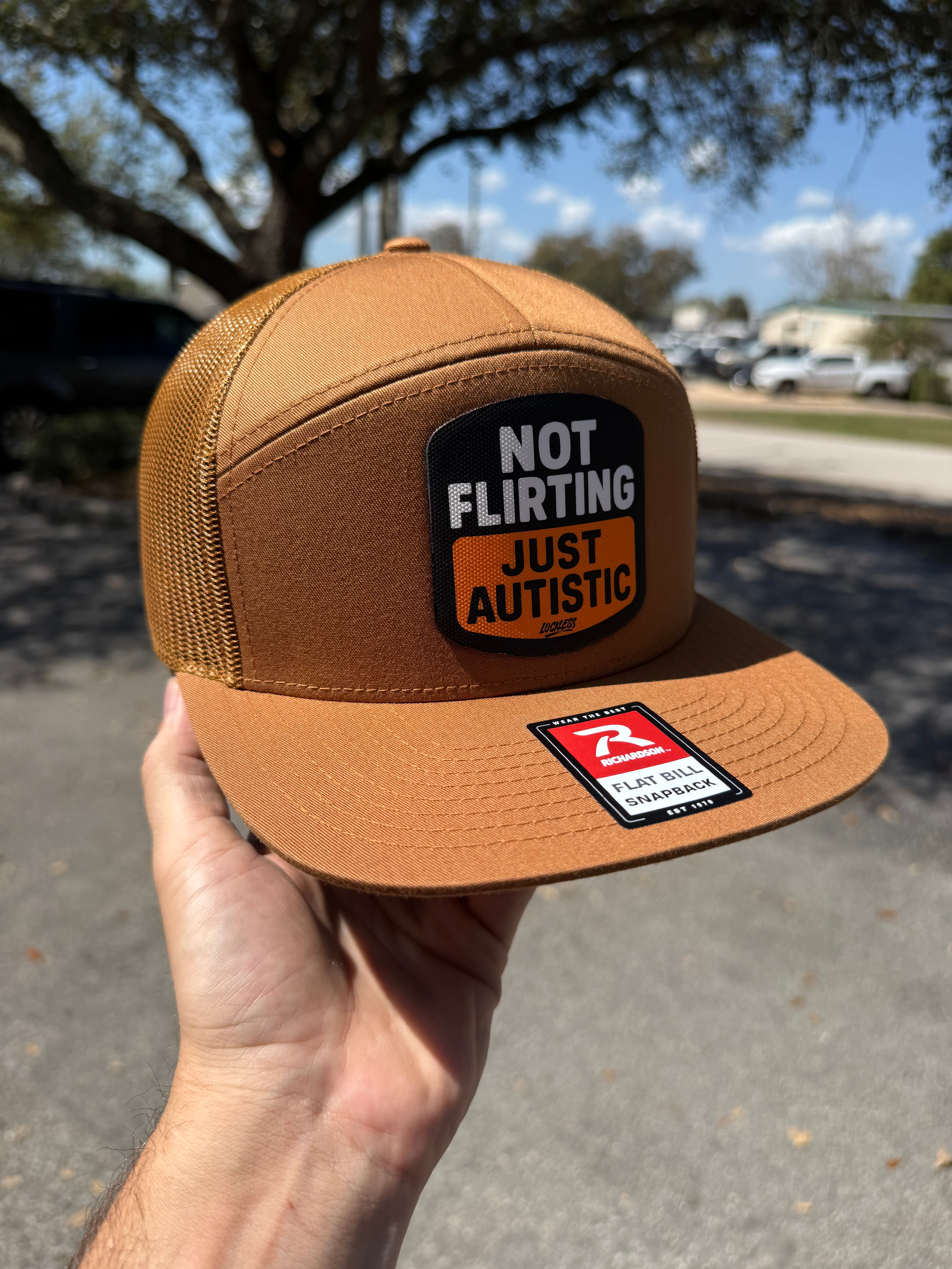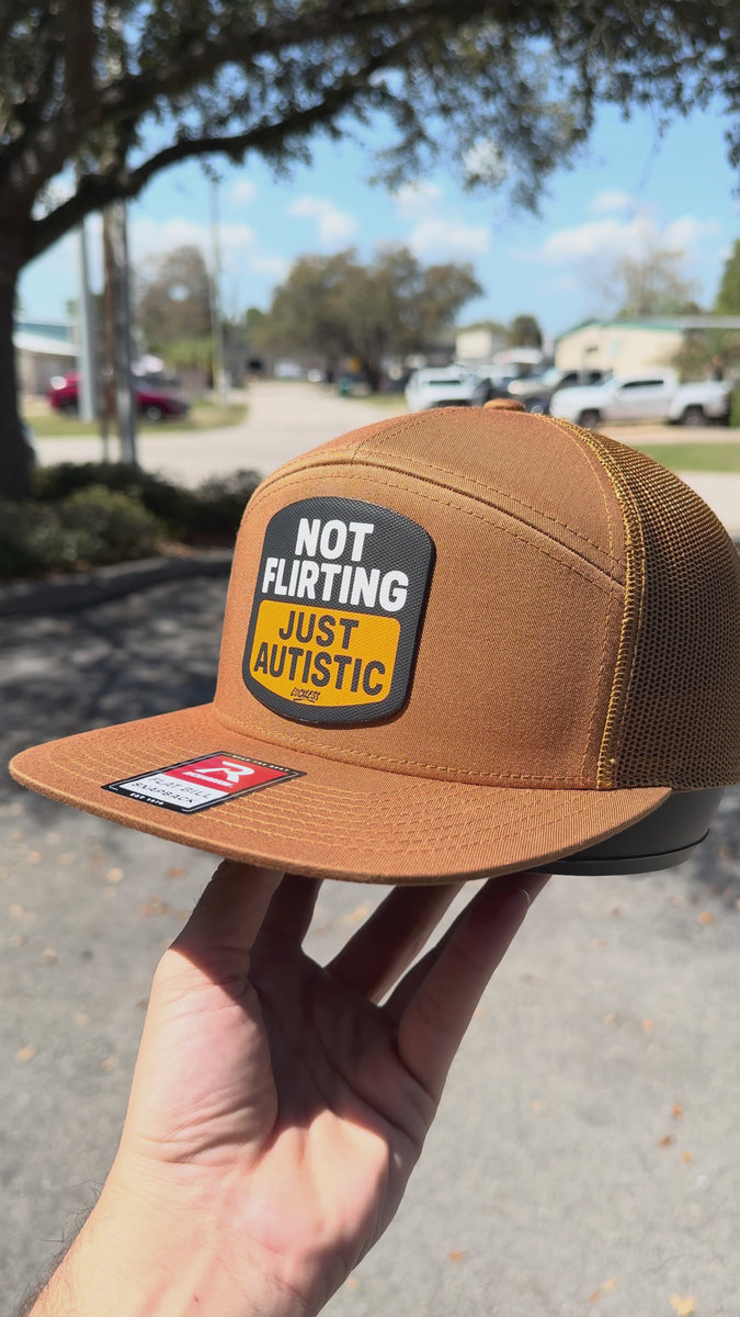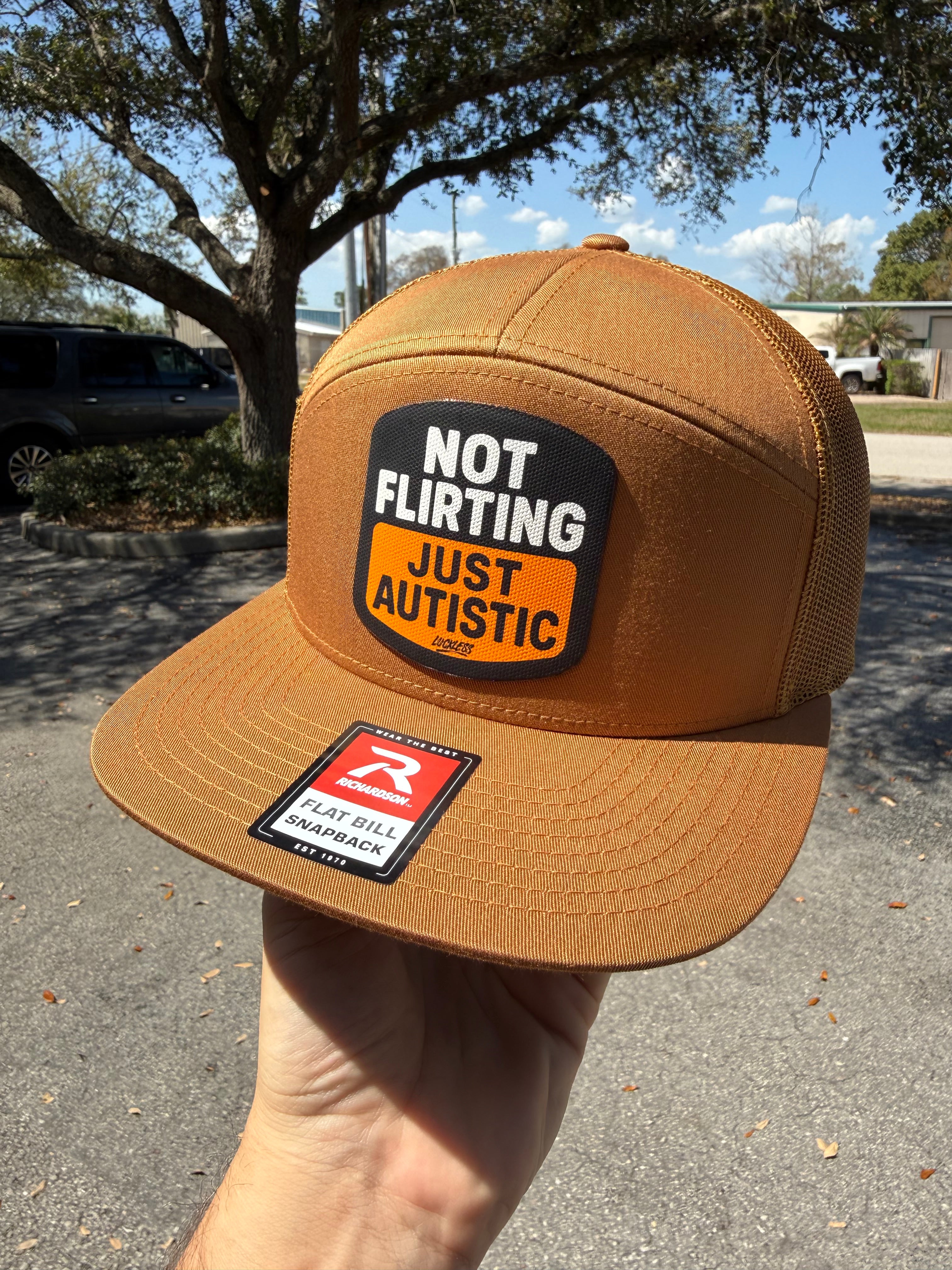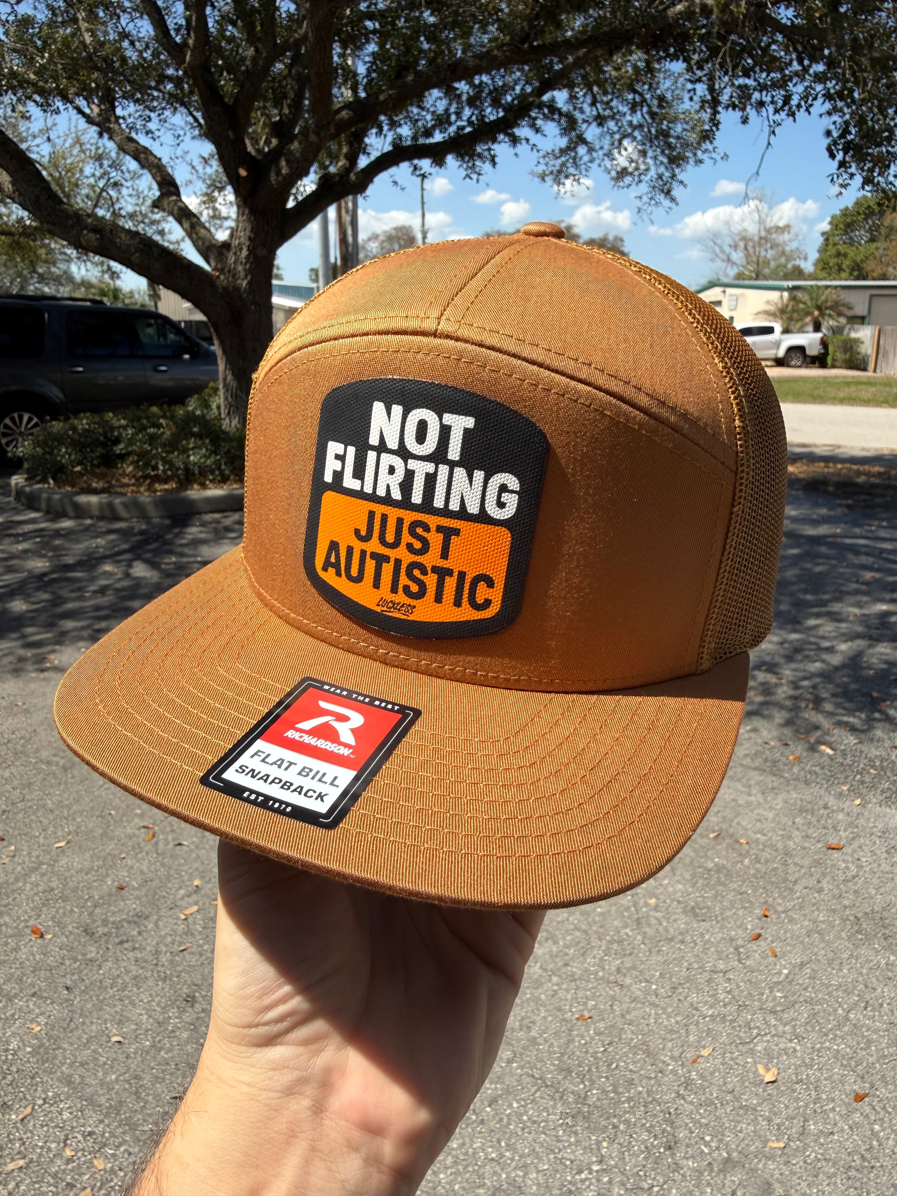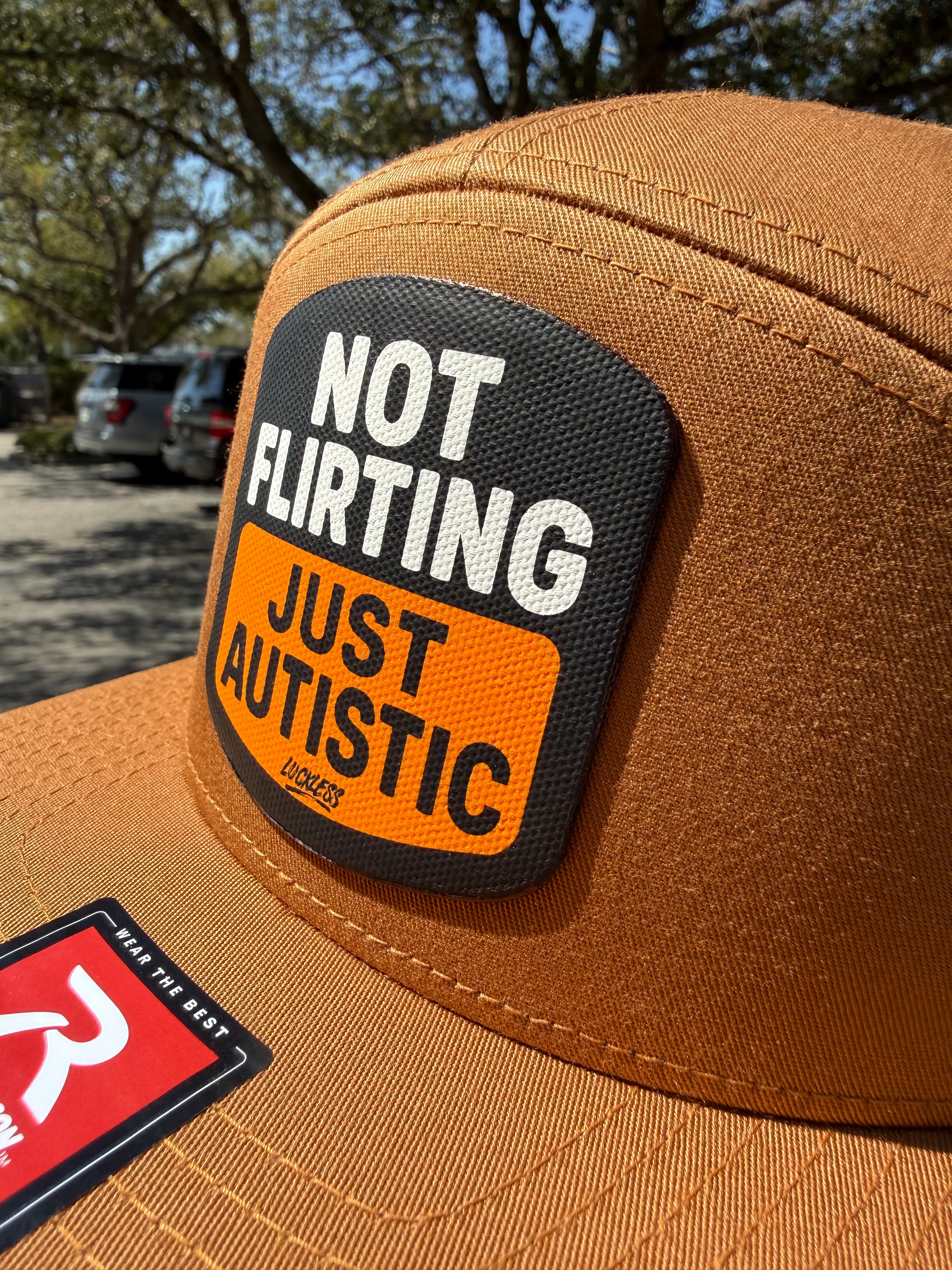 Front and center is a canvas patch applique with a black background, white block lettering, and a warm orange panel across the bottom. The patch text reads “NOT FLIRTING JUST AUTISTIC” with a small Luckless logo tucked underneath. The color combo of brown, black, white, and orange gives it that rugged everyday look while the message does all the heavy lifting.