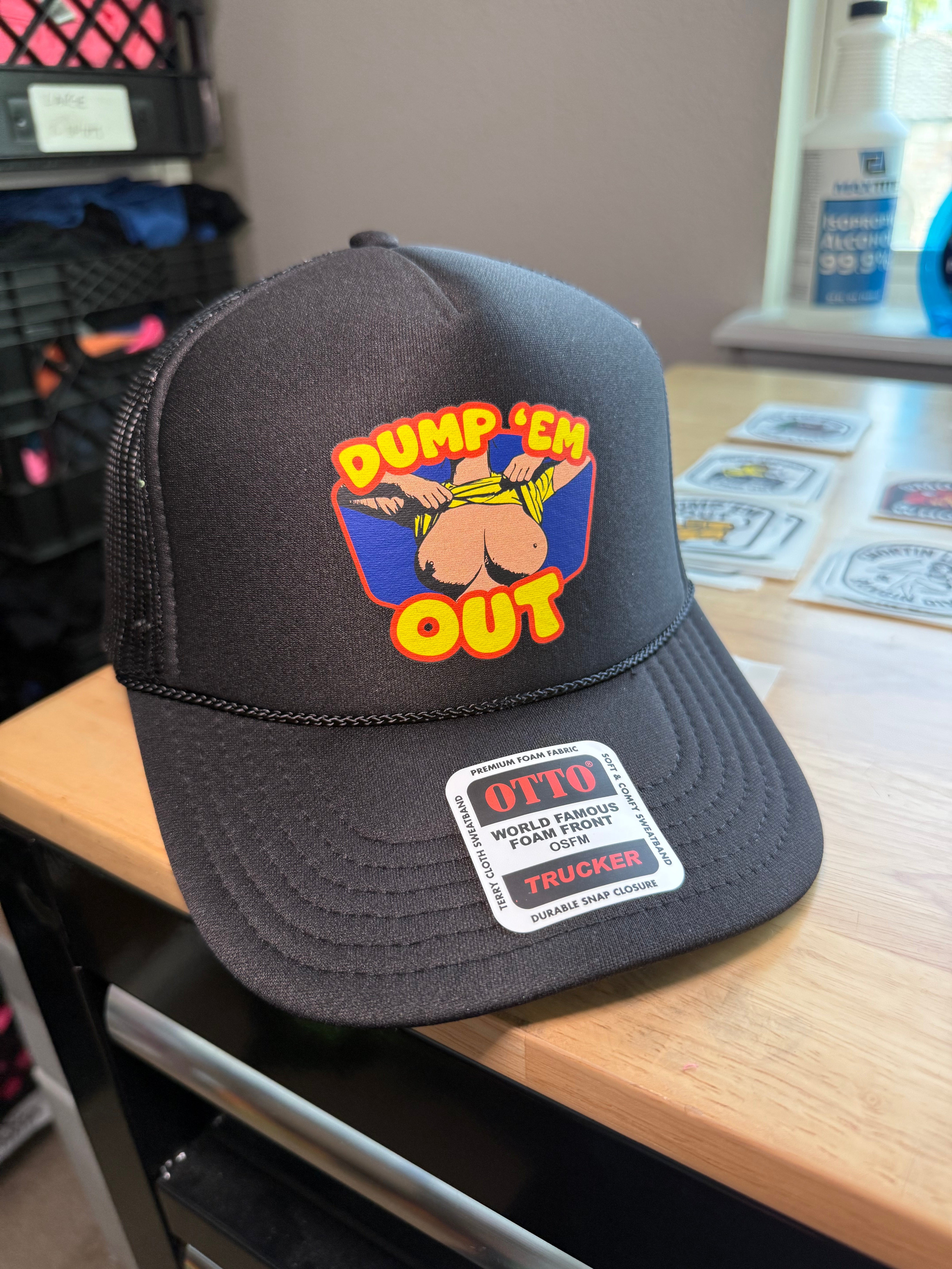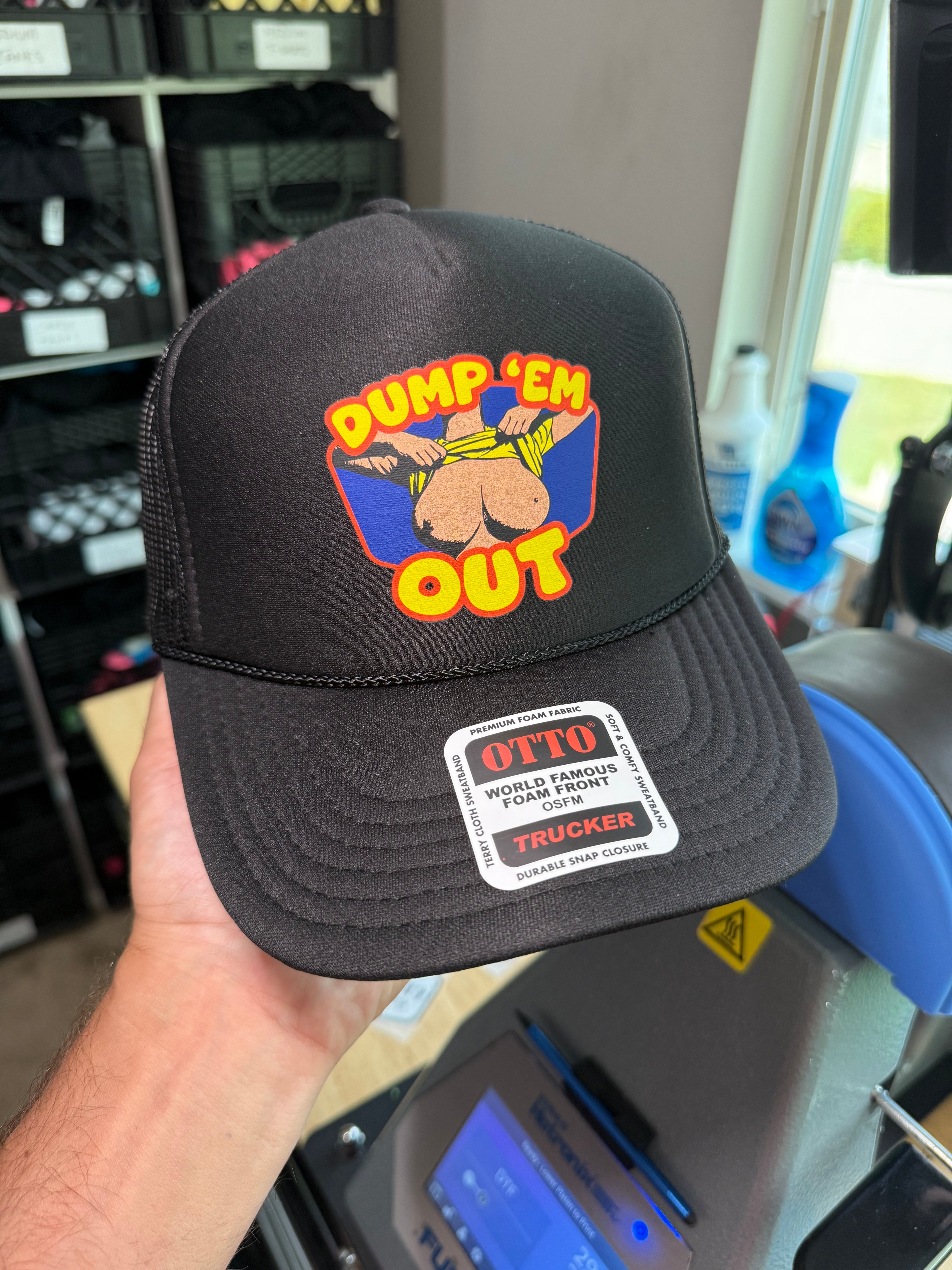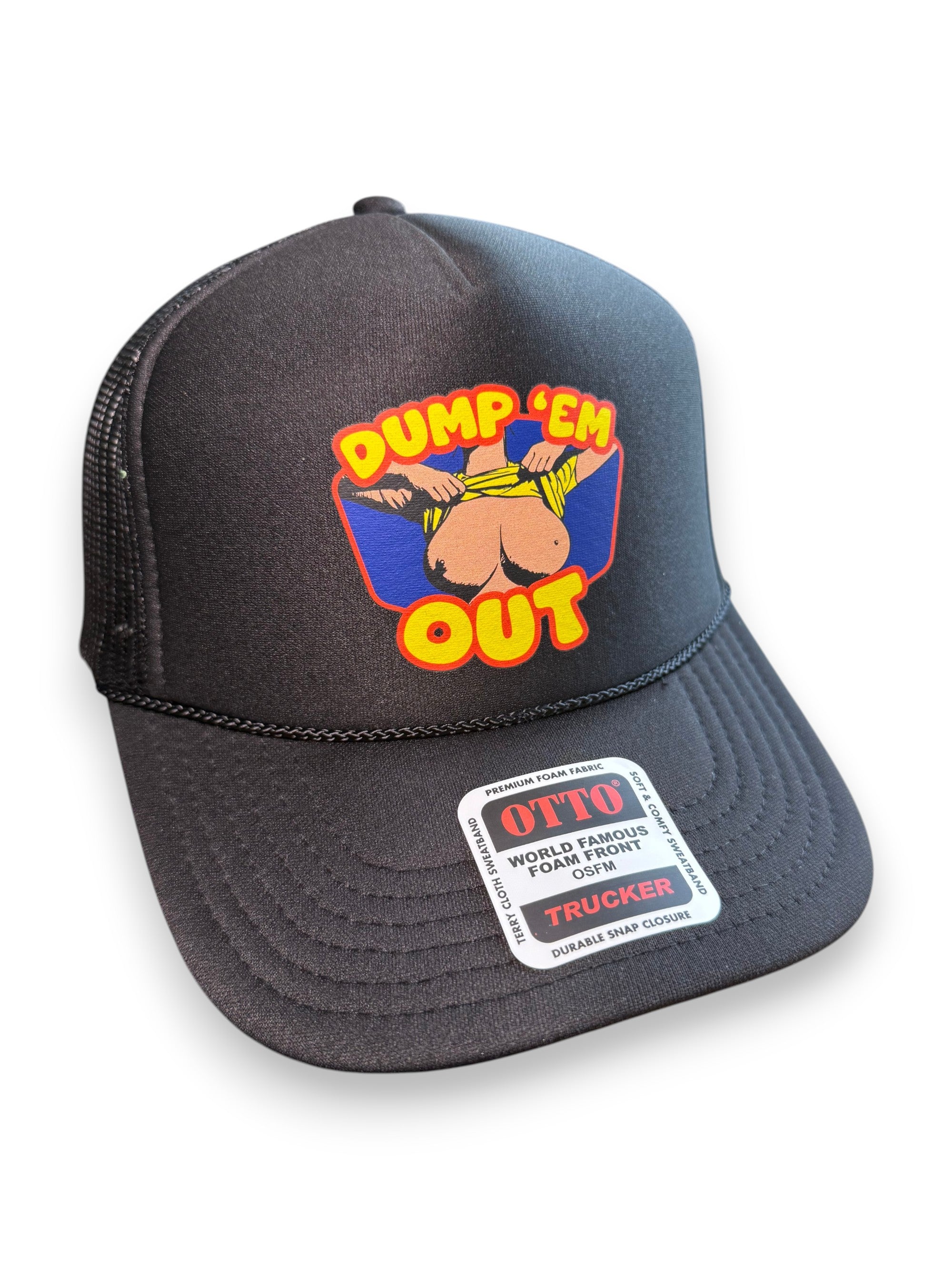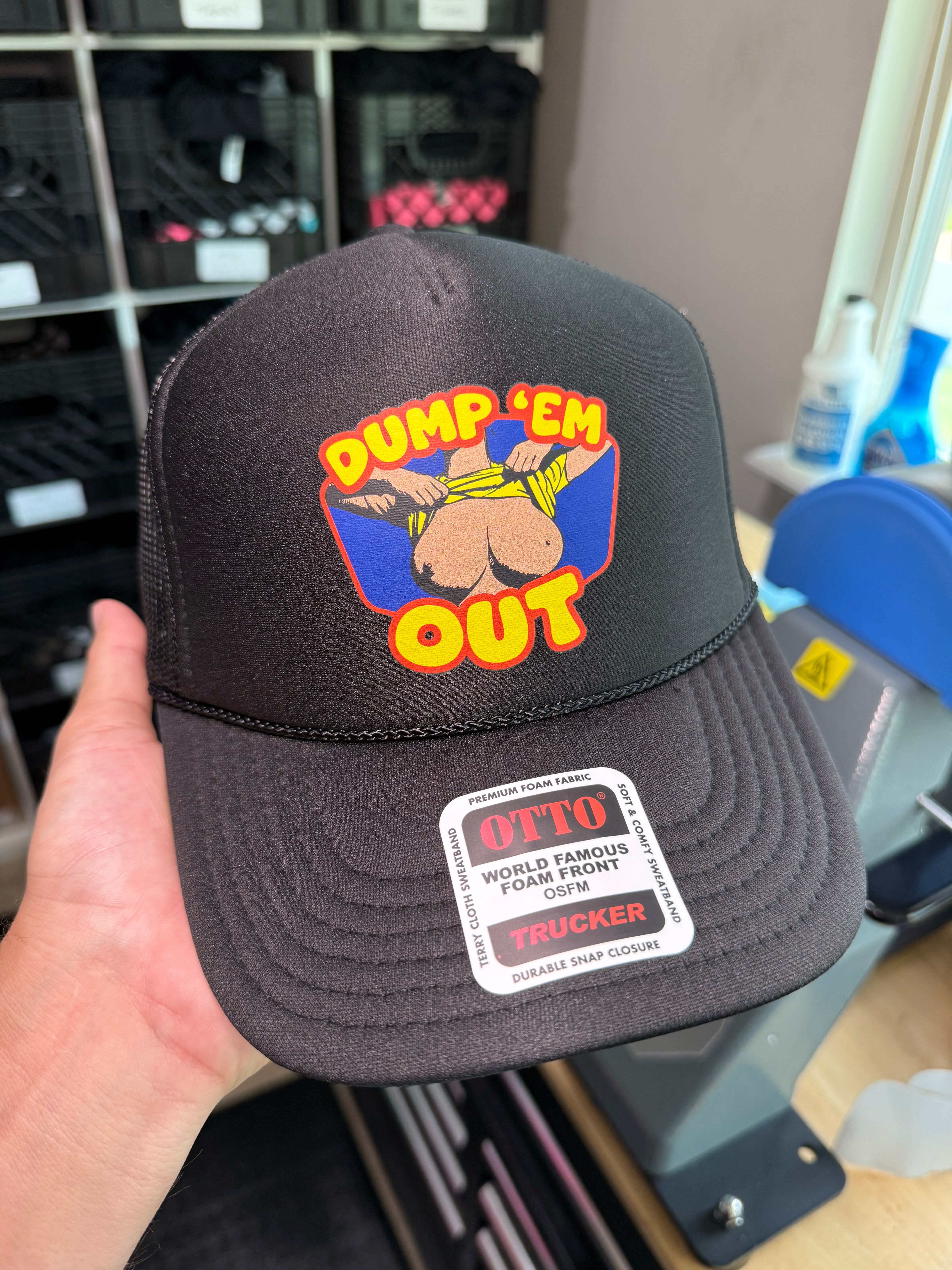 Make your intentions (or sense of humor) loud and proud with the “Dump ‘Em Out” trucker hat – the ultimate headgear for those who live loud, love harder, and DGAF. Featuring a retro cartoon-style graphic of a surprise reveal, this hat is all about turning heads and raising eyebrows.