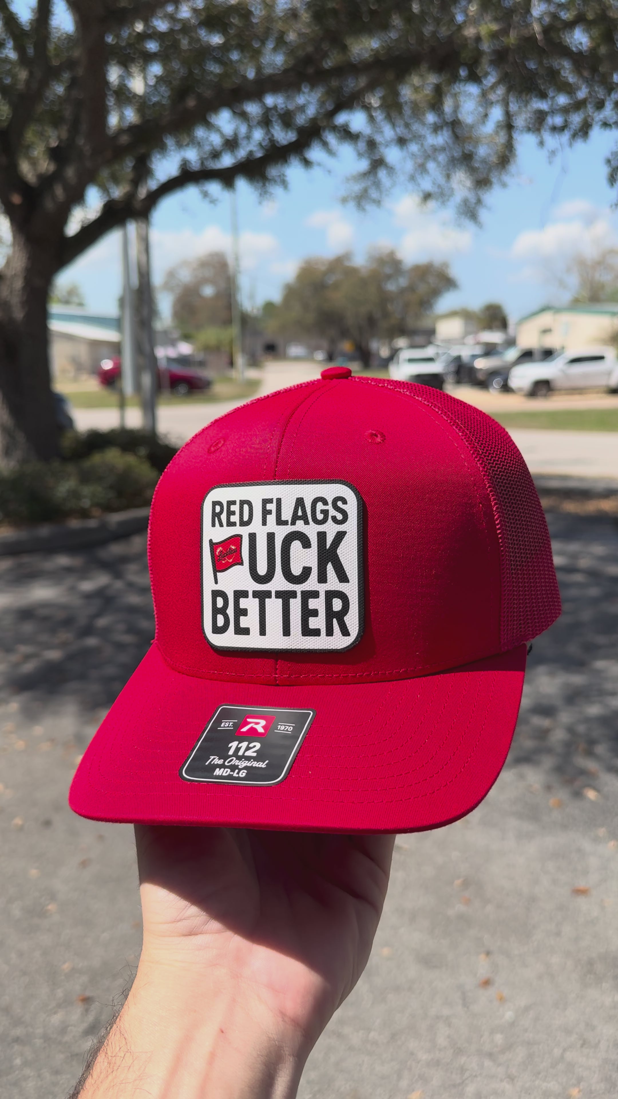 This bold Richardson 112 snapback hat features a bright red crown and bill with a structured fit that sits clean and sharp. Front and center is a white canvas patch applique with a black border, oversized black lettering, and a small red flag graphic stamped with the Luckless name. The patch text reads “RED FLAGS F*CK BETTER”, which is subtle in the same way a tequila shot before noon is subtle.