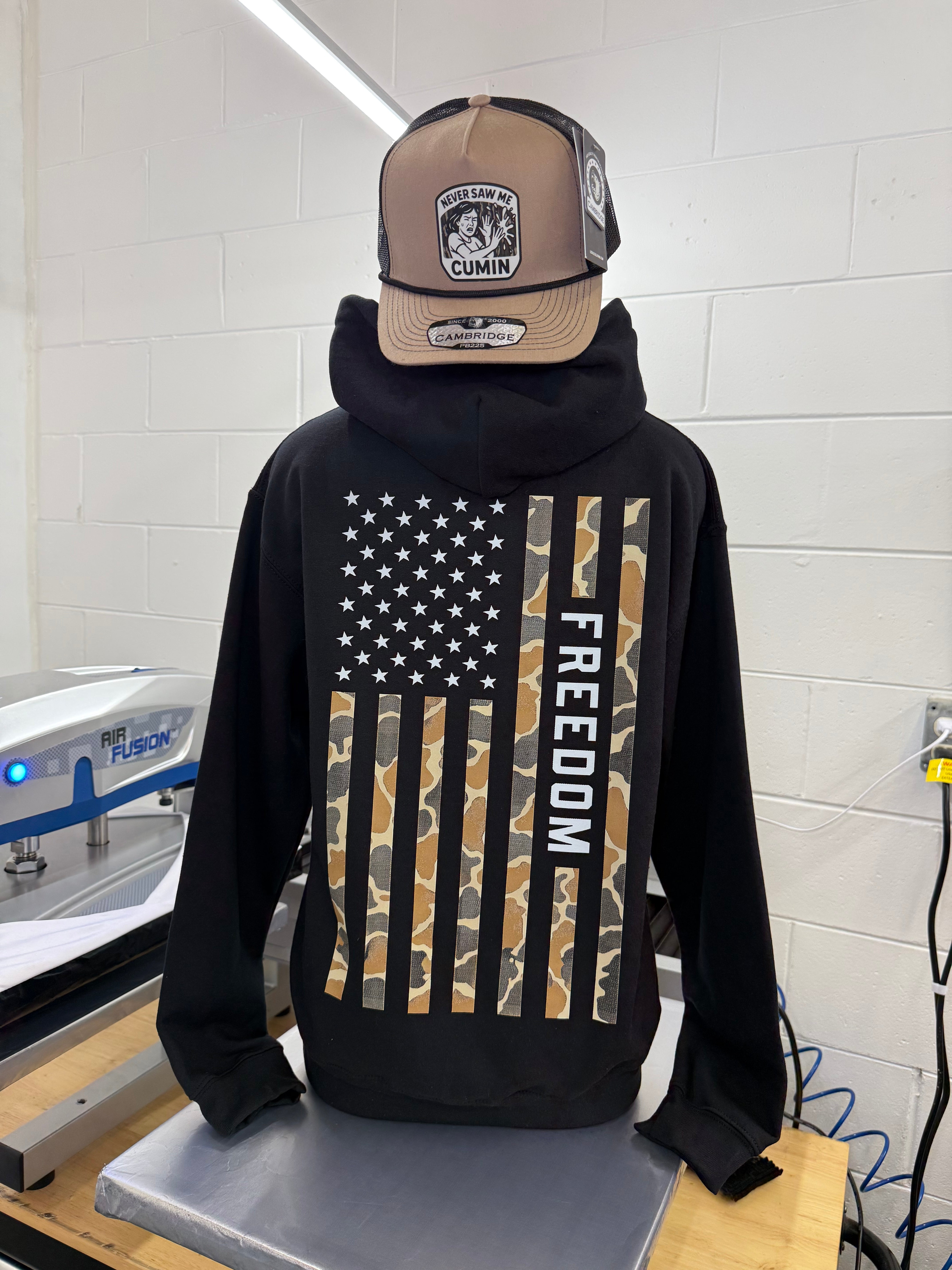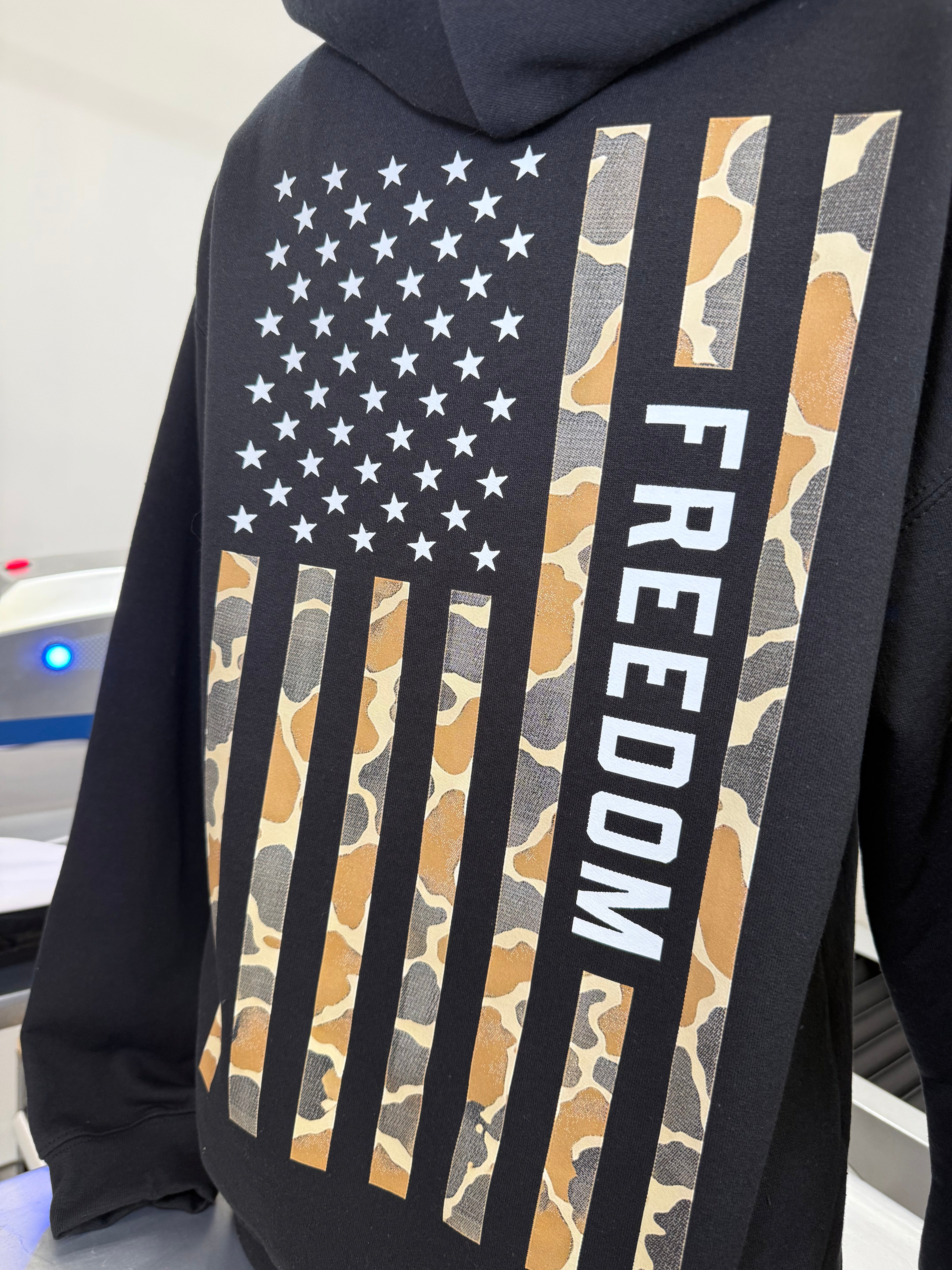 The Freedom Flag | Desert Tan Hoodie features a bold camo American flag design paired with a vertical FREEDOM statement that says exactly what you mean without you having to say a word. Whether you are at the range, the job site, or the gas station grabbing snacks you did not plan on buying, this hoodie handles it.